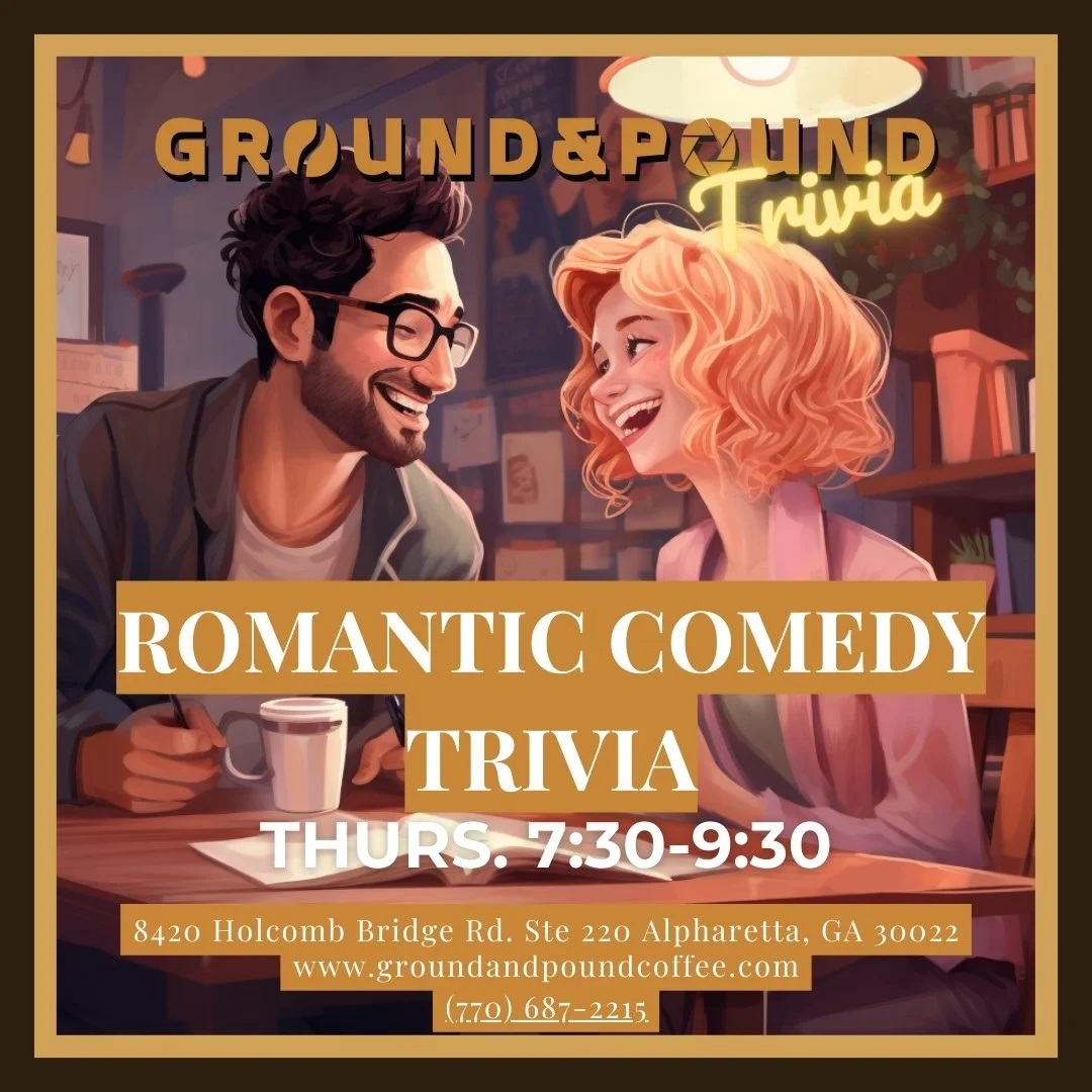 #TriviaNight #GroundAndPoundCoffee #AlpharettaEvents #QuizNight #BrainTeasers #FunWithFriends #WeeklyTrivia #CoffeeLovers #AlpharettaGA #ThursdayTrivia #RomComTrivia